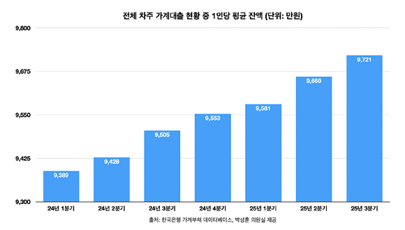 1인당 대출 잔액은 2023년 2분기 말 9332만원을 기록한 이후 9분기 연속 증가했다. 2024년 3분기 말보다는 200만원 넘게 늘었다.