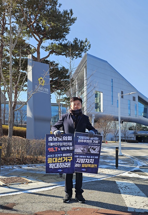 [아이뉴스24 정종윤 기자] 조국혁신당 충남도당이 2026년 지방선거를 앞두고 ‘선거구 쪼개기’ 논란을 겨냥해 제도 개편 저지에 나섰다. 충남도의회 앞에서 1인 피켓 시위를 열고 중대선거구제 도입을 촉구했다.