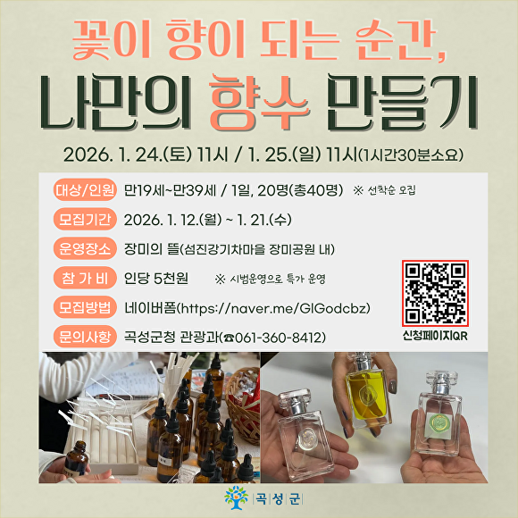 ‘나만의 향수 만들기’ 프로그램은 만 19세부터 만 39세까지를 대상으로 24일과 25일 이틀간 운영된다. 연인과의 데이트는 물론 친구와의 추억만들기·혼자만의 감성 시간으로도 즐길 수 있도록 구성됐다. 참가 신청은 1월 12일부터 1월 21일까지 네이버폼을 통해 선착순으로 접수한다.