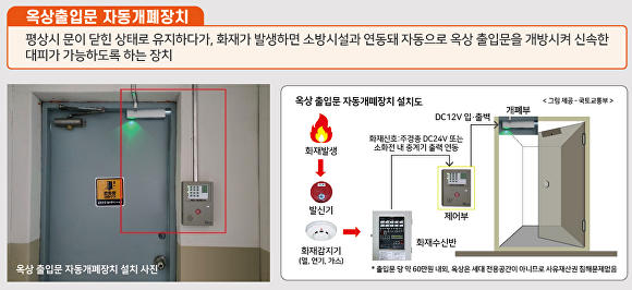 옥상 출입문 비상 자동개폐장치는 평소 문이 닫힌 상태에서 화재가 발생했을 경우 소방시설과 연동돼 자동으로 옥상 출입문을 개방해 신속한 대피를 돕는다.