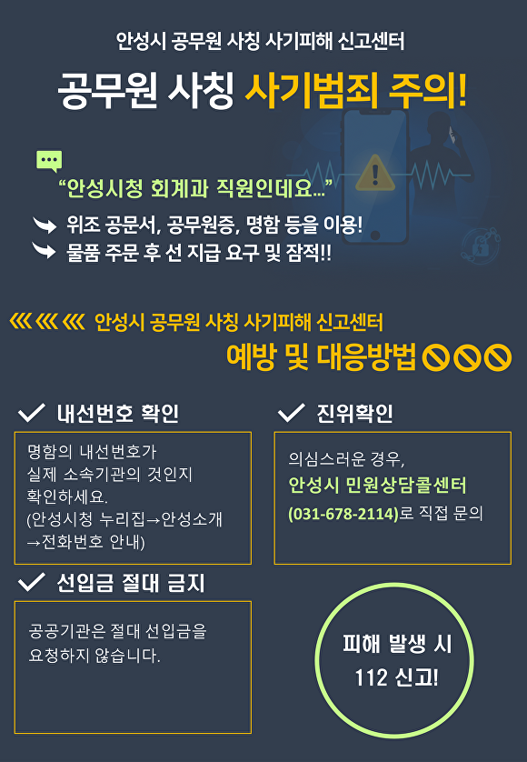 시 관계자는 “안성시 공무원은 어떠한 경우에도 선입금을 요구하지 않는다”며 “수상하거나 의심스러운 연락을 받았을 경우, 즉시 신고센터로 문의해 달라”고 당부했다.
