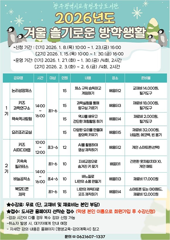 김정희 광주중앙도서관 관장은 “겨울방학을 맞이한 초등학생들이 도서관에서 준비한 다채로운 프로그램에 참여해 유익한 시간을 보내길 바란다”고 말했다.