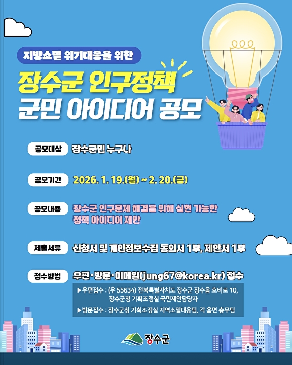 [아이뉴스24 박종수 기자] 전북 장수군은 인구감소 문제에 능동적으로 대응하고 지역 여건에 맞는 실효성 있는 정책을 발굴하기 위해 ‘인구정책 군민 아이디어 공모’를 19일부터 추진한다.