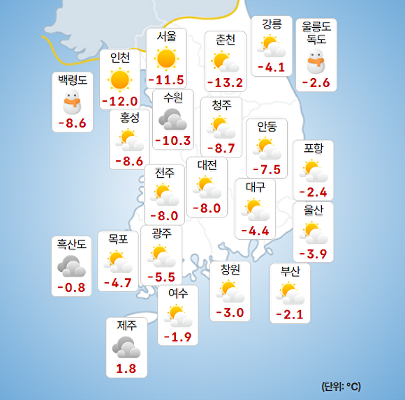 부산지방기상청에 따르면 이날 오전 9시 현재 주요 지역의 기온은 부산 –2.1도, 울산 -3.9도, 창원 -3도로 기록됐다.