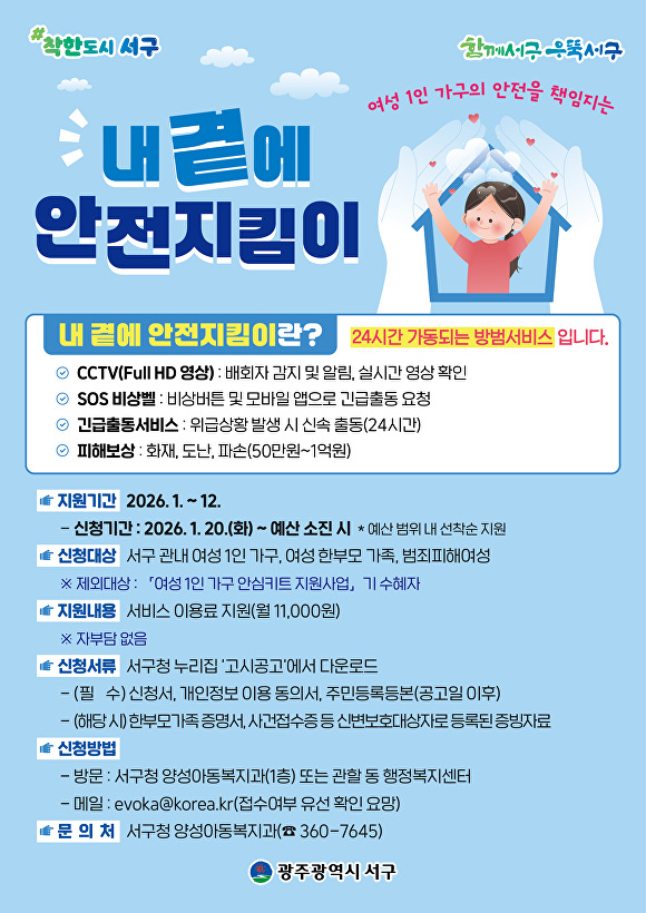 [아이뉴스24 한봉수 기자] 광주광역시 서구는 여성 1인 가구 등의 주거 안전을 위한 ‘안전지킴이 지원사업’을 추진한다.