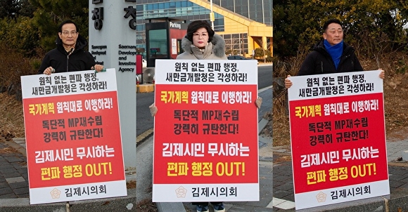 [아이뉴스24 김양근 기자] 전북 김제시의회(의장 서백현)와 새만금 미래 김제시민연대(위원장 강병진)가 지난 19일부터 새만금개발청 앞에서 새만금 기본계획(MP) 내 신항만 유지를 촉구하는 릴레이 공동시위에 돌입했다.
