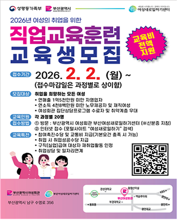 [아이뉴스24 정예진 기자] 부산광역시 여성회관이 ‘2026년 여성직업교육훈련’에 참가할 교육생을 모집한다.
