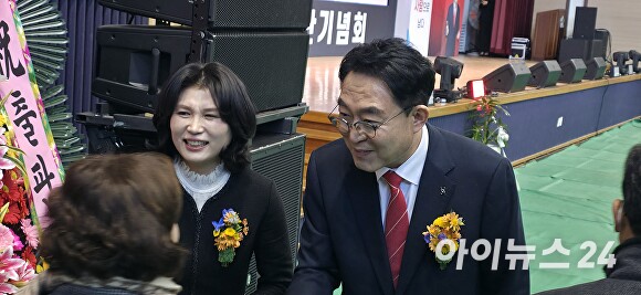 [아이뉴스24 임승제 기자] 오는 6·3 지방선거에서 경남 함안군수 출마를 선언한 차석호 전 경남 진주부시장과 배우자 임미영 씨가 지난 17일 오후 함안체육관에서 열린 저서 '사람은 길을 만들고 행정은 그 길을 넓힌다' 출판기념회를 찾은 주민들에게 인사하고 있다.