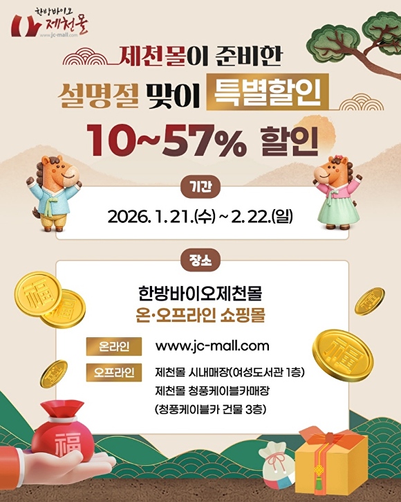 충북 제천한방천연물산업진흥재단은 오는 2월 22일까지 제천몰에서 한방 건강식품과 전통 한약재, 명절 선물 세트 등 다양한 제품을 최대 57% 할인된 가격에 선보인다고 22일 밝혔다.