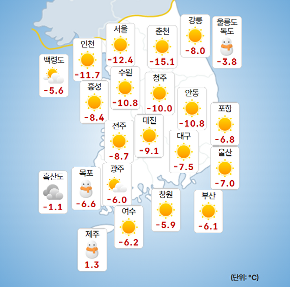 부산지방기상청에 따르면 이날 오전 9시 현재 주요 지역의 기온은 부산 –6.1도, 울산 -7도, 창원 -5.9도로 기록됐다.