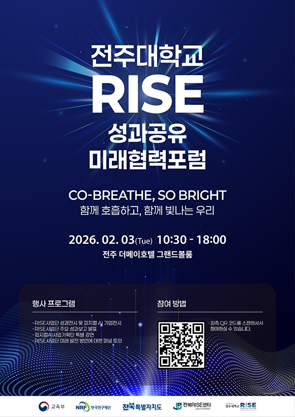 [아이뉴스24 박종수 기자] 전주대학교(총장 류두현) RISE사업단은 지역 기업·기관과 추진한 공동연구, 기술이전, 기업지원 등의 성과를 공유하고 지속가능한 협력 기반을 마련하기 위해 ‘Co-breath, So-bright: RISE 성과공유·미래협력 포럼’을 2월 3일 전주 더메이호텔에서 개최한다.