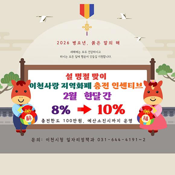 [아이뉴스24 임정규 기자] 경기도 이천시는 설 명절을 맞아 지역경제 활성화와 소상공인 매출 증대를 위해 오는 2월 한 달간 이천사랑지역화폐 충전 인센티브를 기존 8%에서 10%로 상향한다고 29일 밝혔다.