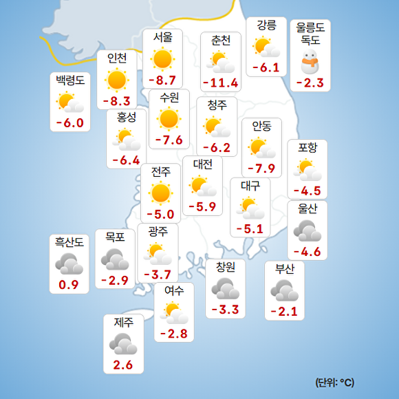 부산지방기상청에 따르면 이날 오전 9시 현재 주요 지역의 기온은 부산 -2.1도, 울산 -4.6도, 창원 -3.3도로 기록됐다.