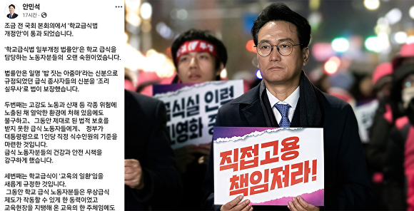 안 대표는 이날 자신의 페이스북을 통해 “국회 본회의에서 ‘학교급식법 일부개정 법률안’이 통과됐다”며 “학교 급식을 담당하는 노동자들의 오랜 숙원이 법으로 보장된 것”이라고 전했다.