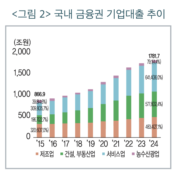 신용상 금융연구원 선임연구원은 1일 "산업별로는 제조업 대출 비중은 2015년 37.0%에서 2024년 27.1%로 낮아졌지만, 건설·부동산업은 같은 기간 22.7%에서 32.4%로 크게 확대됐다"고 밝혔다.