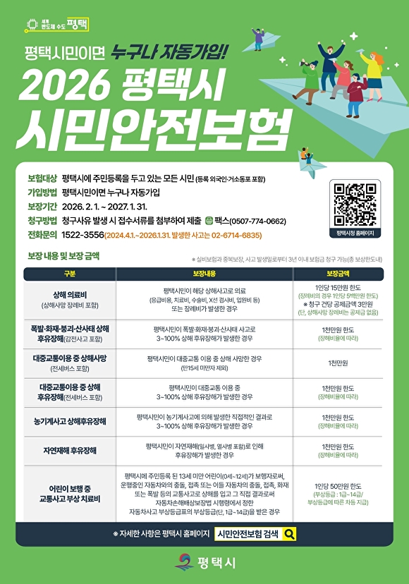 [아이뉴스24 임정규 기자] 경기도 평택시는 일상생활에서 예기치 못한 재난·사고 피해를 지원하기 위한 '2026년 평택시 시민안전보험'을 갱신하고 운영에 들어갔다고 2일 밝혔다.