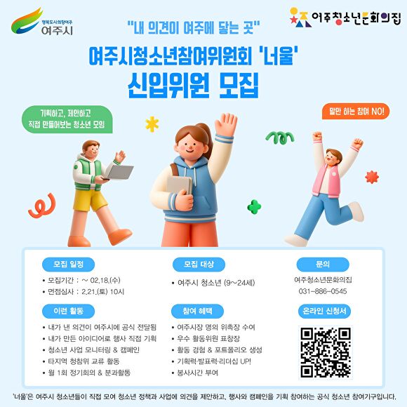[아이뉴스24 임정규 기자] 경기도 여주청소년문화의집은 지역 청소년들의 주체적인 사회 참여를 보장하기 위해 여주시청소년참여위원회 '너울' 제20기 신입위원을 모집한다고 2일 밝혔다.