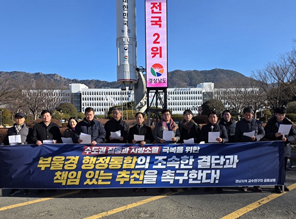 경남 민주교수연대·경남지식연대 소속 교수·연구자 등은 이날 공동성명을 통해 "국가 핵심 사업인 해양·물류를 담당하는 핵심축인 부울경이 오히려 대전·충남, 대구·경북, 광주·전남 등 주요 권역에 비해 뒤쳐지고 있다"며 "타 광역자치단체가 행정통합을 핵심 전략으로 제도적·정치적 논의를 가속화하고 있는데 반해 부울경이 통합 논의에서 뒤처지고 있는 현실에 대해 깊은 우려를 표명한다"고 밝혔다.