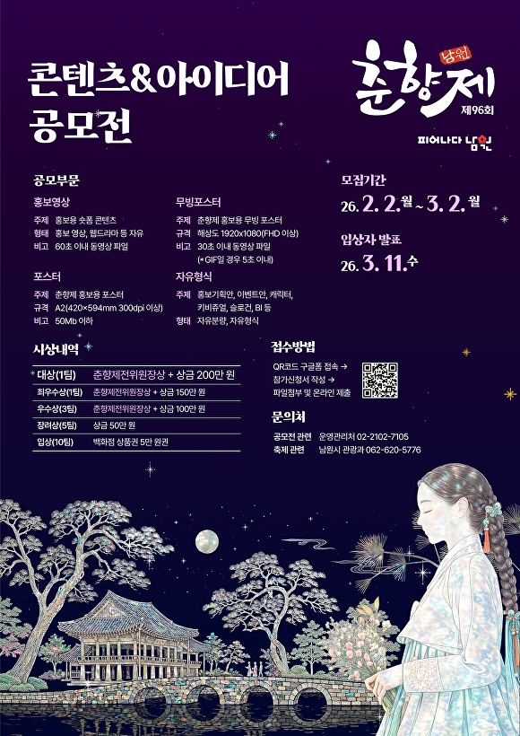 이번 공모전은 지난 2일부터 오는 3월 2일까지 한 달간 진행되며, 수상자에게는 총 1,000만 원 규모의 상금과 함께 남원춘향제전위원장상이 수여된다.