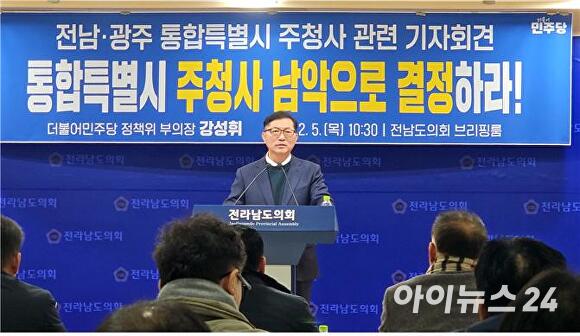 [아이뉴스24 대성수 기자] 강성휘 더불어민주당 정책위부의장이 5일 전남도의회에서 기자회견을 열어 “전남·광주 행정통합의 핵심 쟁점으로 부각된 통합 특별시 주청사를 남악으로 명확히 결정해야 한다”고 주장했다.