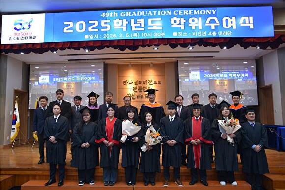 [아이뉴스24 박종수 기자] 전주비전대학교는 2월 5일 교내 비전관 대강당에서 ‘2025학년도 제49회 학위수여식’을 개최하고 전문학사 및 학사과정을 이수한 졸업생 1,017명에게 학위를 수여했다.