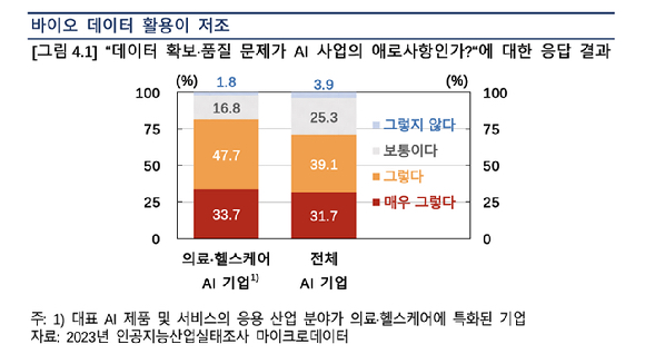 의료·헬스케어 AI 기업의 80% 이상이 데이터 확보와 품질 문제를 겪는 병원 외부 데이터 공유와 데이터 결합 활용 사례가 제한적이라고 지적했다.