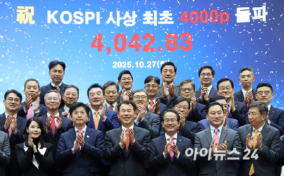 27일 서울 영등포구 한국거래소에서 정은보 한국거래소 이사장(앞줄 왼쪽 네번째)과 증권사 대표들이 코스피 지수 4000 돌파 기념촬영을 하고 있다. [사진=공동취재]