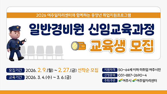 [아이뉴스24 임정규 기자] 경기도 여주시는 중장년층의 재취업을 돕기 위해 '2026년 중장년 일반경비원 신임교육과정' 교육생을 오는 27일까지 모집한다고 10일 밝혔다.