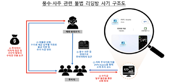 이들 불법 업자는 SNS에서 풍수·사주 콘텐츠로 접근한 뒤 자체 제작한 가짜 주식거래 앱(PIPS Assets)을 설치하도록 유도하고 소액 투자를 통해 수익이 나는 것처럼 조작해 신뢰를 쌓는 수법을 사용한다. 이후 단계적으로 거액 입금을 유도해 자금을 편취하는 구조다.