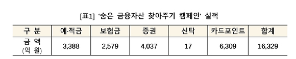 [아이뉴스24 신수정 기자] 숨은 금융자산 찾기 캠페인을 통해 예적금, 보험금, 카드 포인트 등 장기간 찾아가지 않은 금융자산 1조 6329억원이 금융소비자에게 돌아갔다.