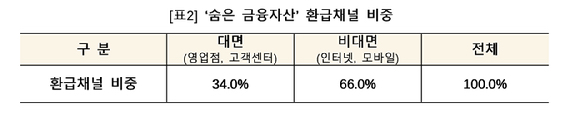 금융위는 "캠페인 이후에도 금융소비자가 영업점이나 인터넷, 휴대전화 앱을 통해 숨은 금융자산을 조회·환급할 수 있다"며 "아직 상당 규모의 숨은 금융자산이 남아 있는 점을 고려해 금융회사별 '숨은 금융자산 현황' 공개를 추진하겠다"고 밝혔다.