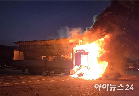이 화재로 14톤 윙바디 1대가 전소하고 적재된 생활용품 및 선물세트 8톤이 불에 탔다.