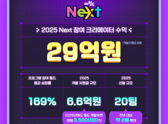 이러한 성장의 배경에는 크리에이터 지원 프로그램 '메월드 Next'가 있다. 넥슨은 2025년 넥스트 프로그램의 지원 대상을 2024년 대비 두 배인 20팀으로 확대했으며, 선정된 팀들은 한 해 동안 총 29억 원의 수익을 기록했다.