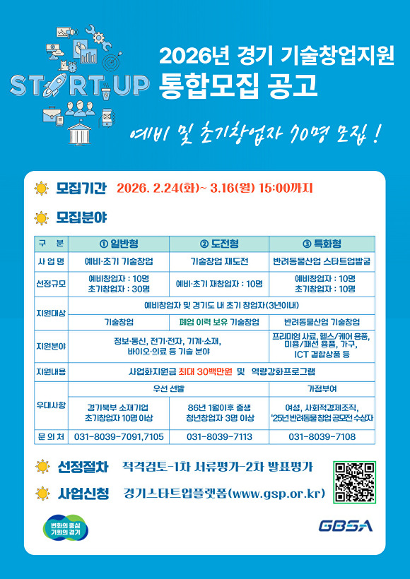 [아이뉴스24 김정수 기자] 경기도와 경기도경제과학진흥원은 다음 달 16일까지 도내 예비창업자와 초기·재도전 창업자를 대상으로한 ‘2026년 경기 기술창업 지원사업’을 통합으로 모집해 총 70개사를 선발한다고 밝혔다.