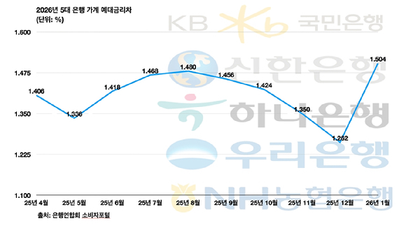 [아이뉴스24 신수정 기자] 지난 1월 5대 은행(KB국민·신한·하나·우리·NH농협)의 정책서민금융을 제외한 신규 취급액 기준 가계 예대금리차가 전월보다 0.242%포인트(p) 늘었다. 지난 8월 이후 다섯 달 만에 확대했다. 5개 은행의 평균은 1.504%였다.