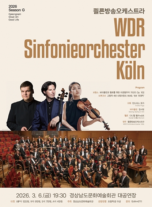 경남문화예술회관 관계자는 "2026 SEASON G 첫 기획 공연인 'WDR쾰른방송오케스트라 공연'은 정통 독일 사운드를 국내에서 만날 수 있는 소중한 기회"라며 "브람스와 브루크너의 명작을 통해 품격 있는 클래식의 진수를 경험하는 특별한 시간이 되길 바란다"고 전했다.