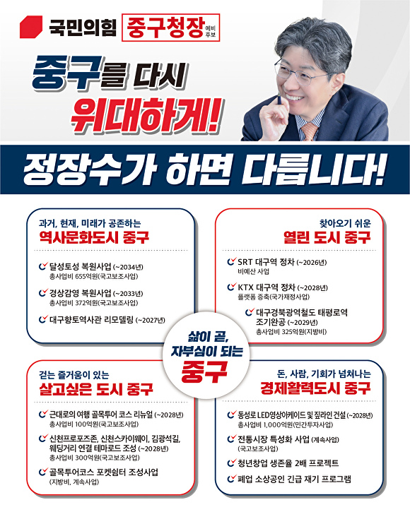 [아이뉴스24 이창재 기자] 6·3 지방선거 대구 중구청장 선거 예비후보인 정장수 전 대구시 경제부시장이 원도심 재도약을 전면에 내건 강도 높은 비전 발표로 승부수를 던졌다.