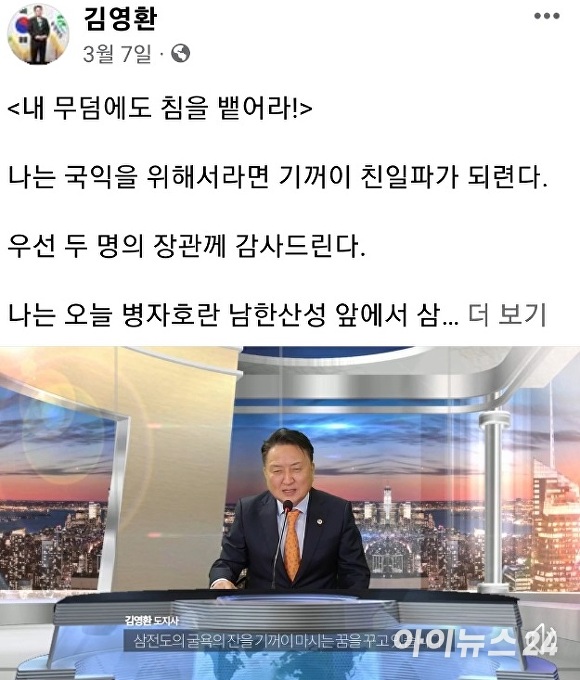 그러면서도 “그런데도 친일파라는 민감한 표현을 써 오해의 소지를 만들고 도민께 걱정을 끼친 것은 저의 불찰”이라며 고개를 숙였다.