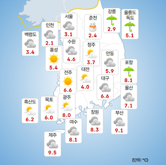 부산지방기상청에 따르면 이날 오전 9시 현재 주요 지역의 기온은 부산 9.1도, 울산 7.1도, 창원 8.3도로 기록됐다.