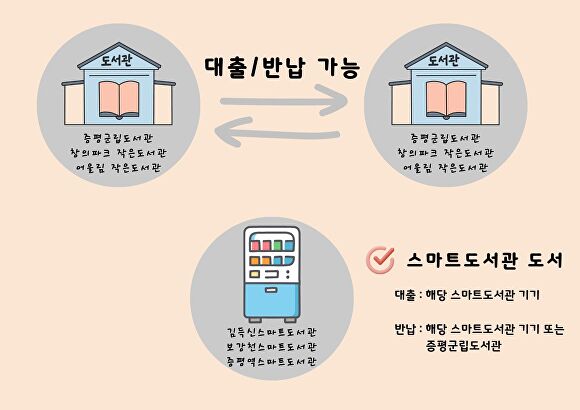 다만, 스마트도서관 3곳(김득신·보강천·증평역)은 무인 운영 시스템 특성상 해당 스마트도서관 또는 증평군립도서관에서만 대출·반납이 가능하다.