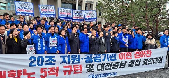 민주당 대전시당은 3일 대전시청 북문 앞에서 ‘매향 5적 규탄 및 대전·충남 통합 결의대회’를 열고 대구·경북 통합법안만 단독 처리하려는 움직임을 중단하고 대전·충남과 동시 추진할 것을 요구했다.