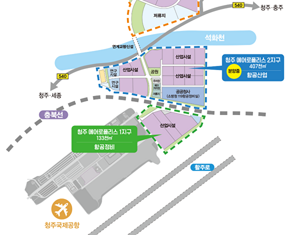 청주 에어로폴리스는 현재 1지구와 2지구 조성이 끝나, 항공 정비와 항공 연관 기업 입주가 가능한 상태다. 3지구 개발도 추진 중이다.