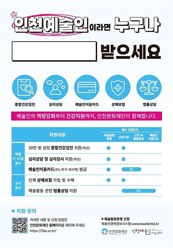 [아이뉴스24 장호찬 기자] 인천문화재단(대표이사 이종관, 이하 재단)이 지역 예술인의 복지 향상을 위한 종합 지원을 추진한다. 예술인의 신체적·정신적 건강은 물론 창작 과정에서 겪는 법적 권리 보호까지 아우르는 종합 지원 체계로 운영한다. 주요 지원 항목은 종합건강검진,전문 심리상담 및 검사 ,법률상담 분야다.