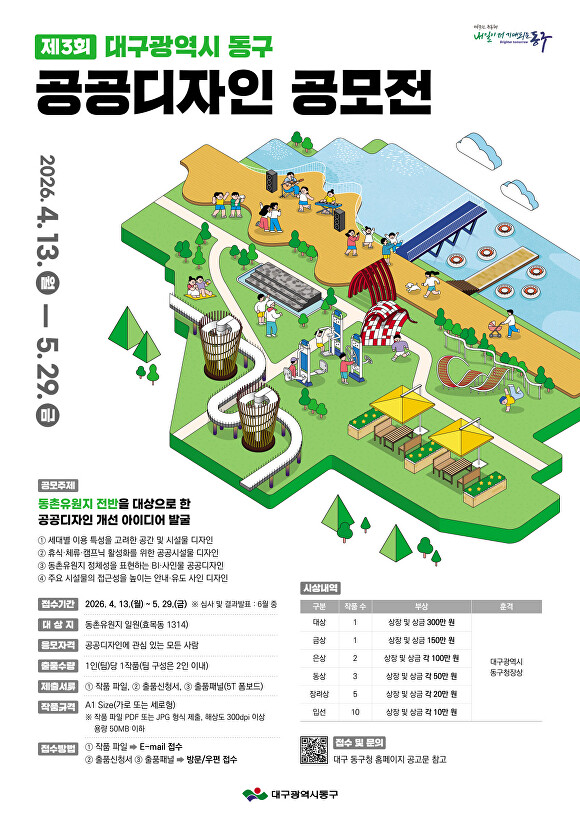 윤석준 동구청장은 “이번 공모전은 동촌유원지를 관광과 주민 일상이 공존하는 생활 인프라 공간으로 한 단계 도약시키기 위해 마련됐다”며 “창의적이면서도 실현 가능한 공공디자인 아이디어가 많이 발굴되기를 기대한다”고 말했다.