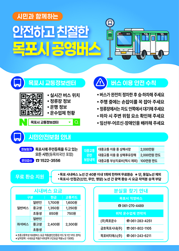 [아이뉴스24 대성수 기자] 목포시가 시민들의 안전하고 편리한 대중교통 이용을 위해 공영버스 관련 다양한 지원제도와 이용 정보를 적극 안내하고 있다.