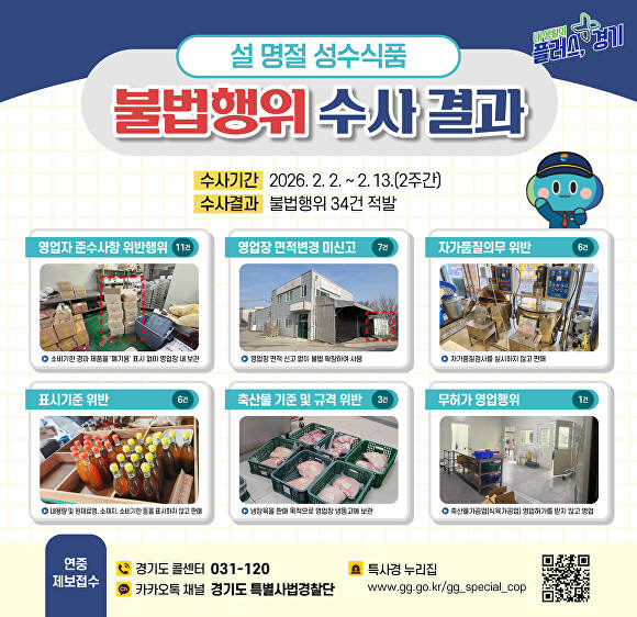 [아이뉴스24 김정수 기자] 경기도 특별사법경찰단이 설 명절 성수식품 불법행위를 수사해 영업자 준수사항 위반과 영업장 불법 확장 등 총 34건을 적발한 것으로 나타났다.
