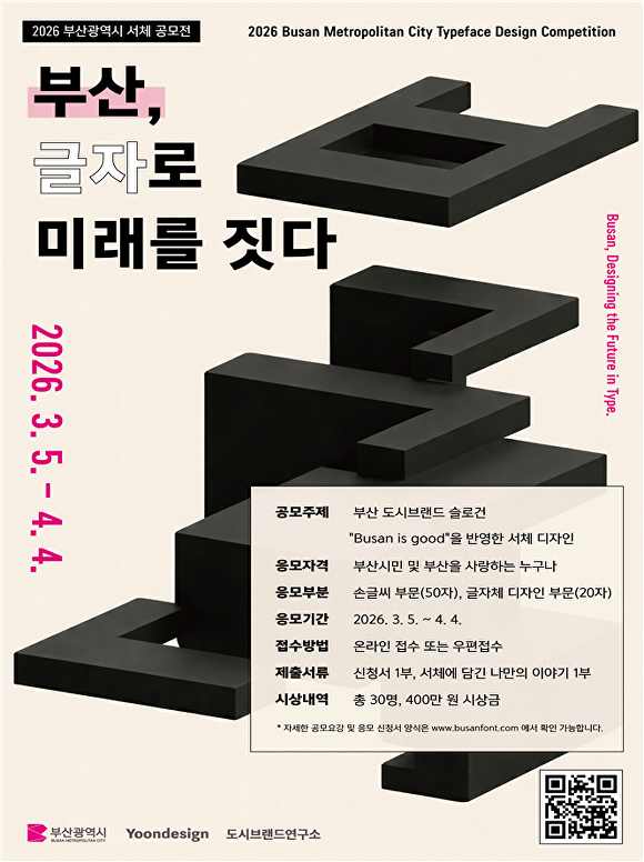 문정주 부산광역시 미래디자인본부장은 “이번 공모는 시민들이 부산 도시브랜드의 주인공이 되는 의미 있는 시작”이라며 “시민의 상상력과 창의성이 담긴 글자가 실제 도시브랜드 자산으로 개발될 수 있는 만큼 많은 참여를 바란다”고 말했다.