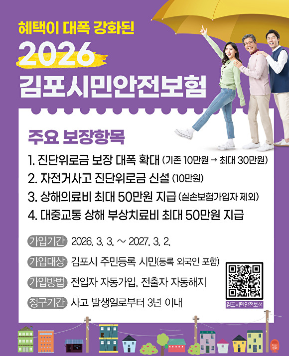 시는 3일부터 시민들이 일상생활 중 겪을 수 있는 불의의 사고에 대비해 보장 항목을 강화한 ‘2026년 김포시민안전보험’을 시행한다고 밝혔다.