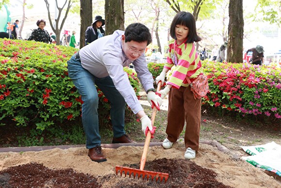 이상일 시장이 어린이와 함께 시민참여정원 행사에서 흙을 고르고 있다. [사진=용인특례시]