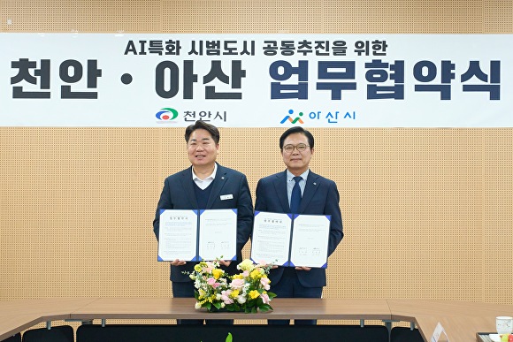 천안시는 6일 천안아산상생협력센터에서 김석필 천안시장 권한대행과 오세현 아산시장이 참석한 가운데 ‘AI 특화 시범도시 공동 추진 업무협약’을 체결했다고 밝혔다.